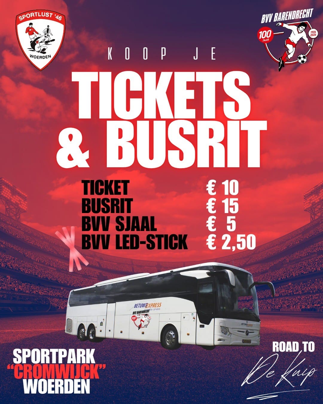 Ruim 300 supporters zullen de manschappen van trainer Dogan Corneille ondersteunen. Voor de supportersbussen zijn nog enkele kaarten beschikbaar. Voor slechts € 25 krijg je een ticket voor de wedstrijd én rij je vanaf de parkeerplaats van sportpark De Bongerd heen en weer naar Woerden. Tegen een kleine extra vergoeding is ook mooie BVV-merchandise te verkrijgen om BVV Barendrecht zichtbaar te supporten. Wil je dus toch nog graag mee met de bus en/of nog kaarten kopen? Stuur voor meer informatie een e-mail naar martijn@bvvbarendrecht.nl.